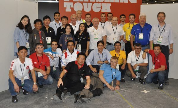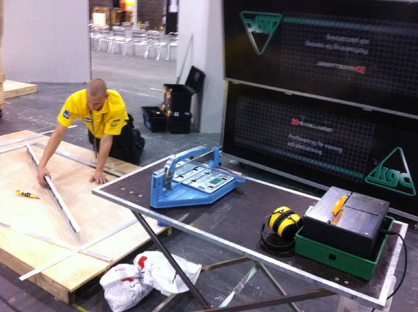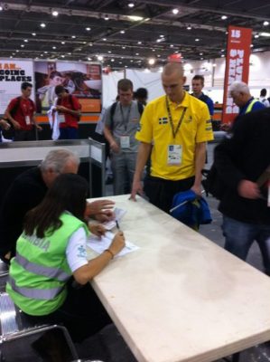 Det hela började med en lättare skärskada men efter mycket snabb och professionell sjukvård tappade vi inte något av förberedelsetiden. Värre var det för Australiensaren som var tvungen att operera bort en tånagel och tappade tre timmar, sen hade deras vattentråget till deras vattensåg spräckts i transporten. Argentina hade inga verktyg så det var lindrigt strul för oss trots allt. Det viktigaste är att fokusera på uppgifterna som komma skall. Under måndagen fick de tävlande möjlighet att ställa i ordning sin arbetsstation och kolla alla verktyg. De fick även möjlighet att justera ev ojämnheter på underlaget. Tack och lova hade vi en av de bästa väggarna med minst ojämnheter så vi blev snabbt klara och kunde fokusera på annat. Alla plattor ligger på plats och är kollade o rengjorda, vinklar på plats m.m