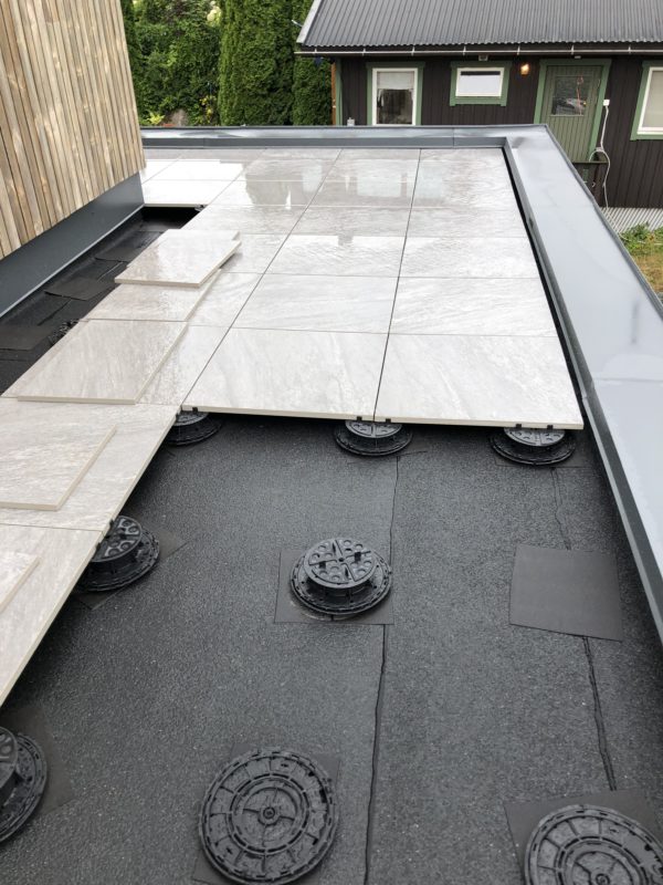 En variant av så kallad raised floor installation är den här lösningen från Profilitec. Piedestalerna som vi använder oss av är de mest flexibla på marknaden och ger en enkel och exakt installation. Fördelen med den här metoden med piedestaler är att den är just flexibel. Du kan enkelt lyfta bort en platta om du behöver komma in under. Om du vill dra el eller vatten under sommarhalvåret så är det inga problem. Fördelarna mot ett tralldäck är många, framförallt så krävs inget underhåll mer är sopning och en avspolning då och då. Inga stickor, inga skruvskallar som sticker upp, ingen oljning krävs och du behöver inte vara orolig för fläckar av ex vin eller marinader.