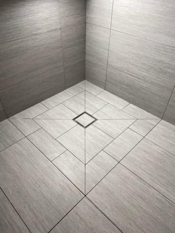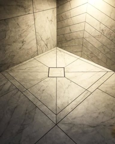 Kuvertfall som det till vänster är en typ av fall som är vanligare i USA enlig Deniz. I det aktuella badrummet hade kunden sett ett sånt fall på Instagram och bad specifikt om det. Duschväggen kommer följa fallet och hamna mitt i den längsgående fogen. Ingång i duschen blir med andra ord längst ned till höger i bild.