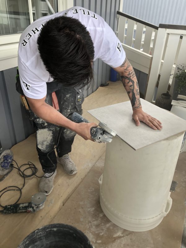Att gera hörnen som alternativ till hörnlister har blivit allt mer populärt. Vi vårt besök hos kakelbröderna i Trollhättan fick vi ett smakprov på hur de jobbar. Deniz gerar alltid på fri hand. Han menar att det inte är svårt bara man tar sig tid att träna och prova sig fram till en metod som passar ens eget sätt att jobba. Först lägger han en vinkel med diamantskivan. Hans tips är att kapa lite brantare än 45 grader då det ändå inte syns efteråt. Efter det tar han sina polerpads och finputsar tills han får den yta han vill ha.