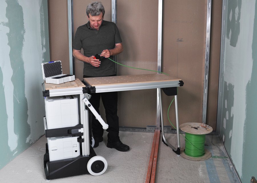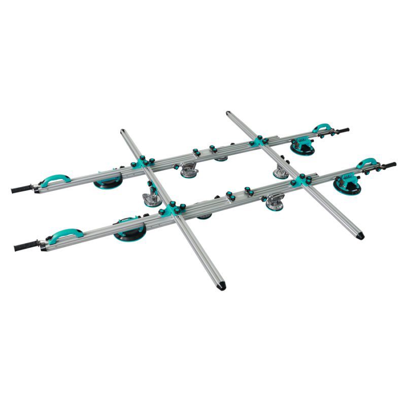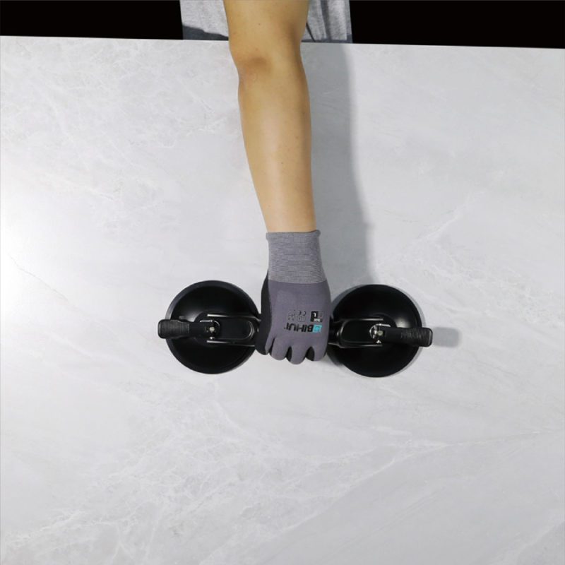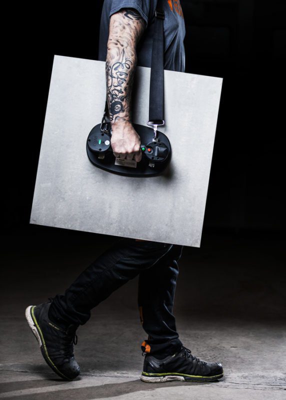 Vanligtvis bär vi in paketen i badrummet öppnar dem där och sätter plattorna i fixet. Med de nya stora formaten behöver vi tänka om ibland för att få ihop det. Kanske behöver du rent av två arbetsbord. Ett större där du kan kapa och borra i plattorna och ett mindre att ha i badrummet för att kunna dubbellimma plattorna innan montering. Just dubbellimningen är högst aktuell särskilt då de allra flesta använder någon form av nivåsystem vid sättning. En bärrigg som den större från Bihui nedan krävs om du ska jobba med sk Slabs, plattor större än 120×120. Upp till 120×120 så klarar man sig rätt bra med tex Montolit lift. Man bör dock vara två som hanterar de plattorna.