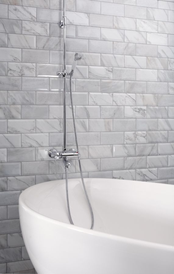 Ett klassiskt kakel med fasad kant i snygg modern stil med marmorering som ger en lyxig känsla. Tidlöst och elegant på samma gång. Den fasade kanten ger en reflexeffekt i olika ljus.