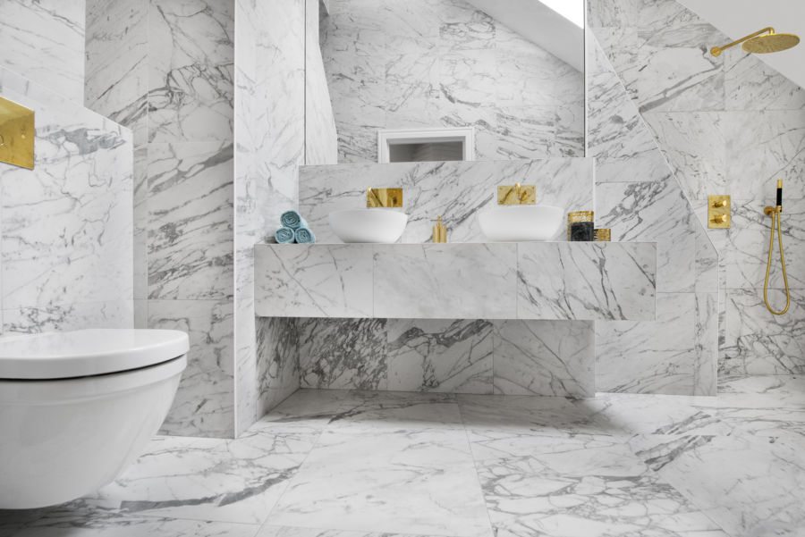 Statuario Honed är en serie i granitkeramik med marmorkänsla och mycket naturtroget mönster med samma oändliga variation som riktig Carraramarmor.