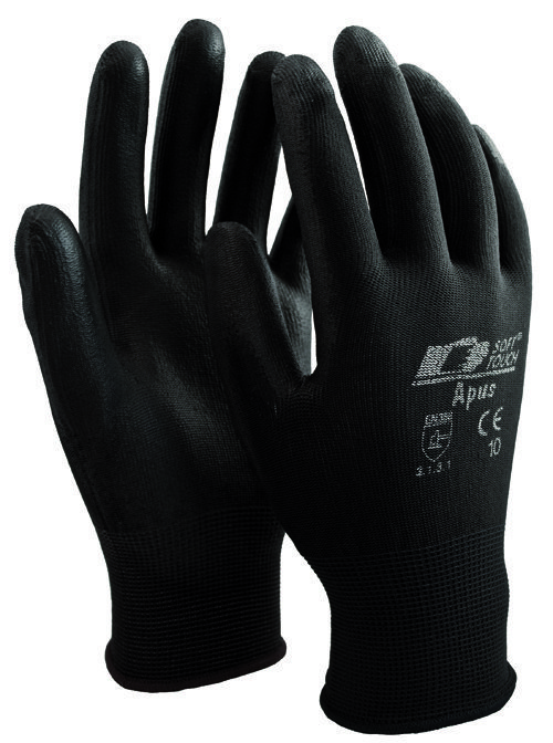 Sömlös stickad handske i nylon som är doppad i svart PU i innerhand och över fingertopparna.