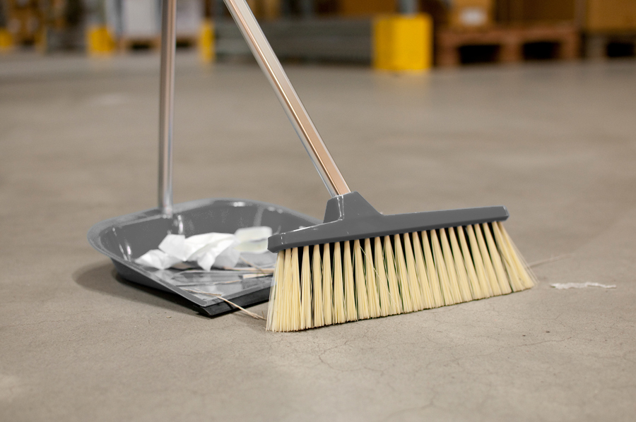 Sopborste med plastrygg och borst av PET. Skaft av aluminium med upphängningskrok och hål för handledsstöd