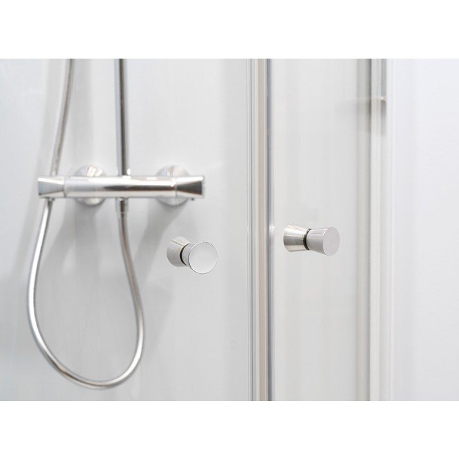 De ställbara gångjärnen lyfter dörrarna 7 mm och dörrar i 6 mm härdat glas med en släplist mot golvet.