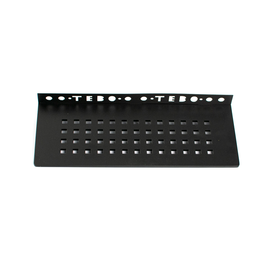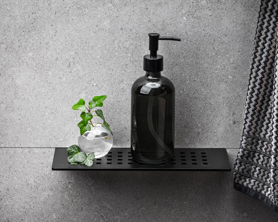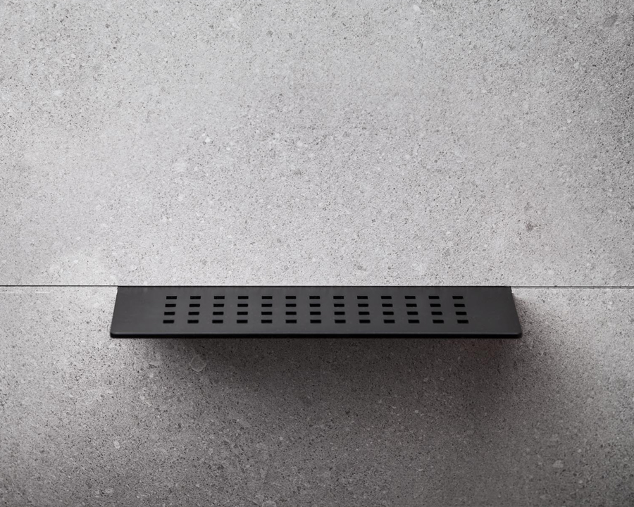 Stilren rak matt svart pulverlackerad duschhylla. Tillverkad av rostfritt stål typ AISI 430. Hyllans kant fästs bakom plattan i samband med plattsättning. Godstjocklek: 4,3 mm. Ej syrafast.