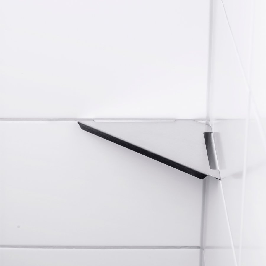 Elegant duschhylla av borstat rostfritt stål typ AISI 304. Godstjocklek: 1 mm. Hyllan fästs i fogen med silikon. Passar i 90° hörn. Ej syrafast.