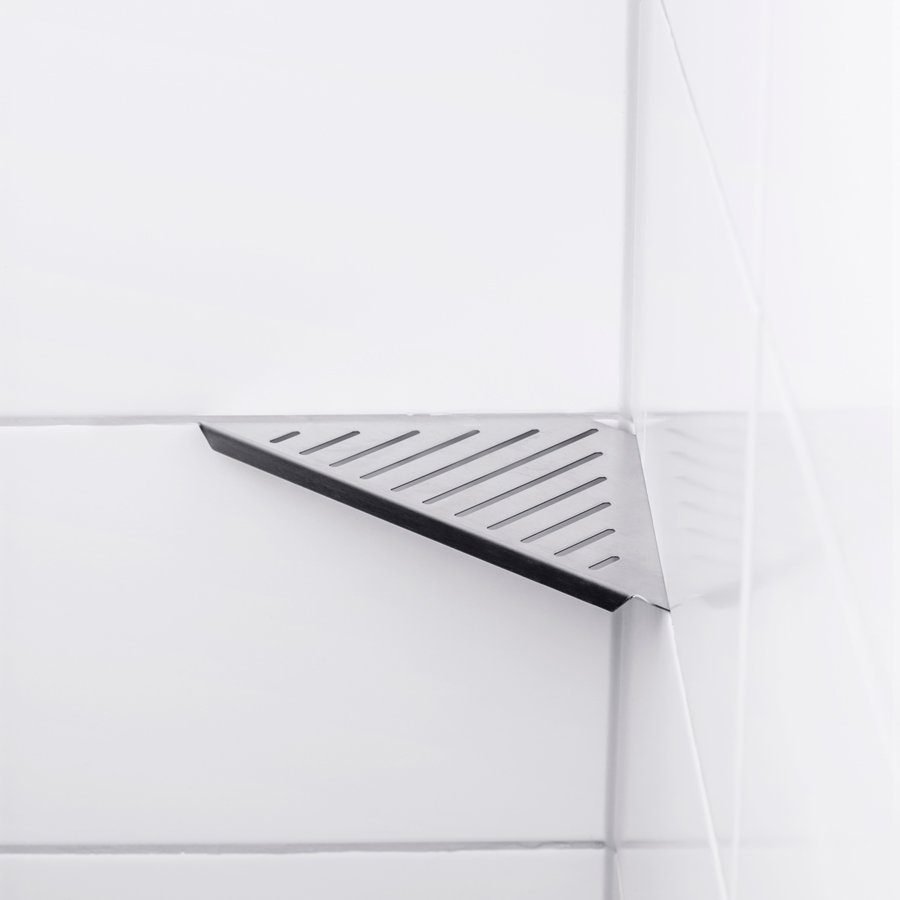 Elegant duschhylla av borstat rostfritt stål typ AISI 304. Godstjocklek: 1 mm. Hyllan fästs i fogen med silikon. Passar i 90° hörn. Ej syrafast.