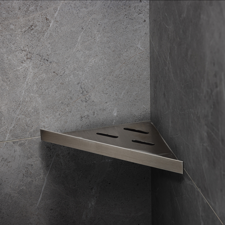 Elegant duschhylla för montering med keramiska plattor i hyllan. Hyllan fästs i fogen med silikon. Passar i 90° hörn. Tillverkad av borstat rostfritt stål typ AISI 304. Godstjocklek: 1,2 mm. Ej syrafast.