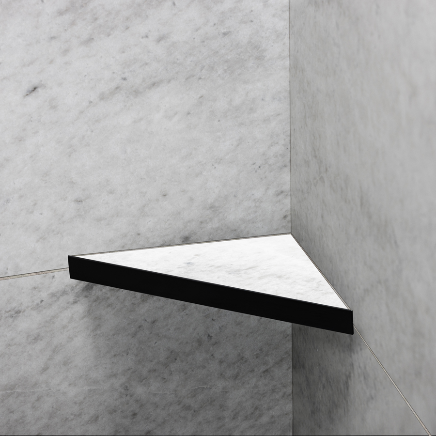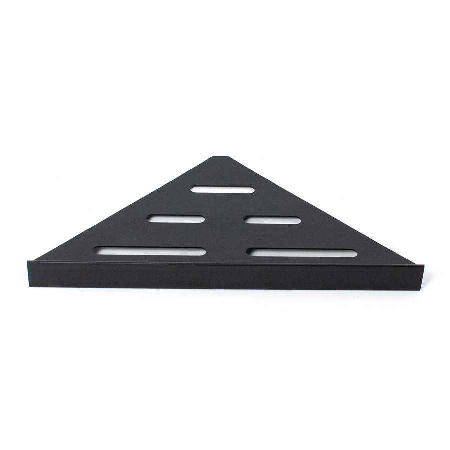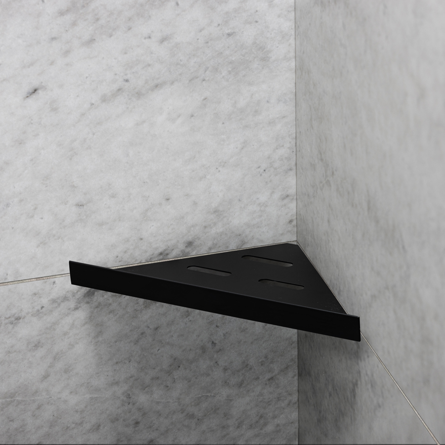 Elegant duschhylla för montering med keramiska plattor i hyllan. Hyllan fästs i fogen med silikon. Passar i 90° hörn. Tillverkad av matt svart pulverlackerat rostfritt stål typ AISI 304. Godstjocklek: 1,2 mm. Ej syrafast.