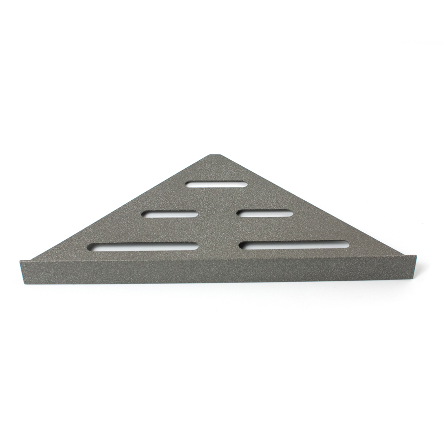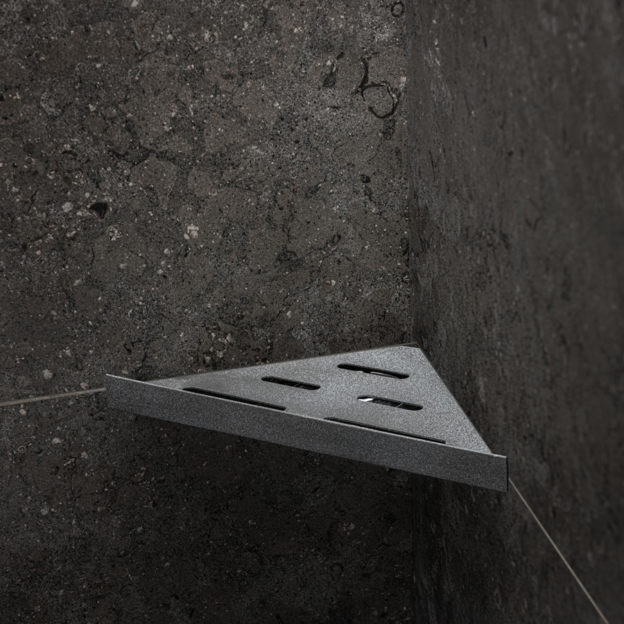 Elegant duschhylla för montering med keramiska plattor i hyllan. Hyllan fästs i fogen med silikon. Passar i 90° hörn. Tillverkad av pulverlackerat rostfritt stål typ AISI 304 med Stone-finish i färgen mörk granit. Godstjocklek: 1,2 mm. Ej syrafast.