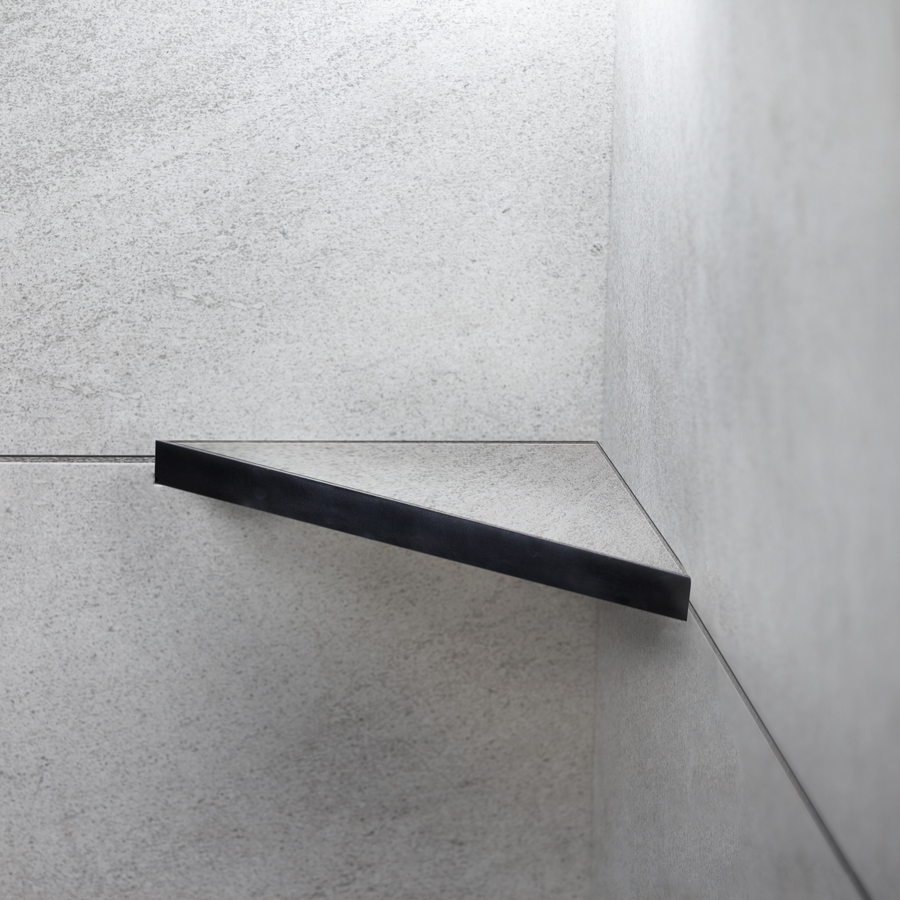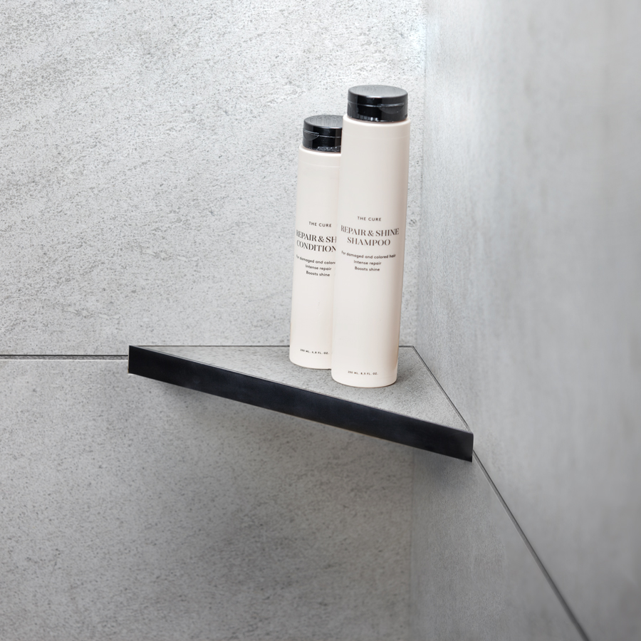 Elegant matt svart pulverlackerad duschhylla för montering med/utan keramiska plattor i hyllan.
