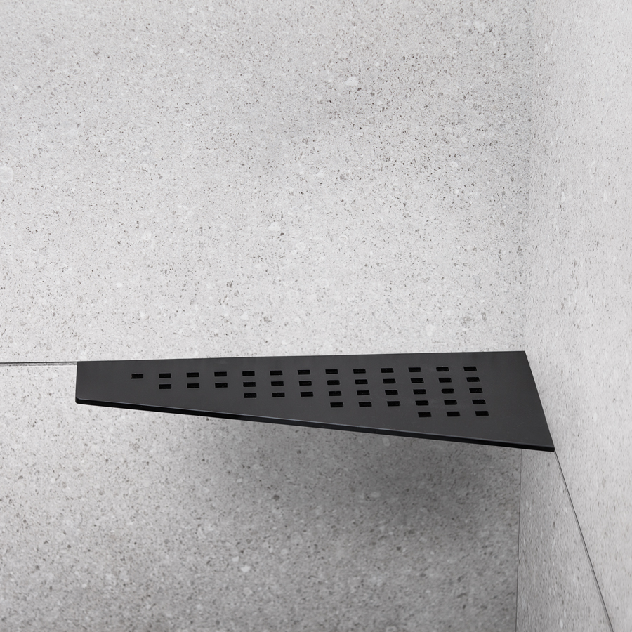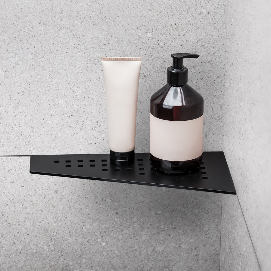 Elegant matt svart pulverlackerad duschhylla av rostfritt stål typ AISI 304. Godstjocklek: 4 mm. Hyllan fästs i fogen med silikon. Passar i 90° hörn. Ej syrafast.