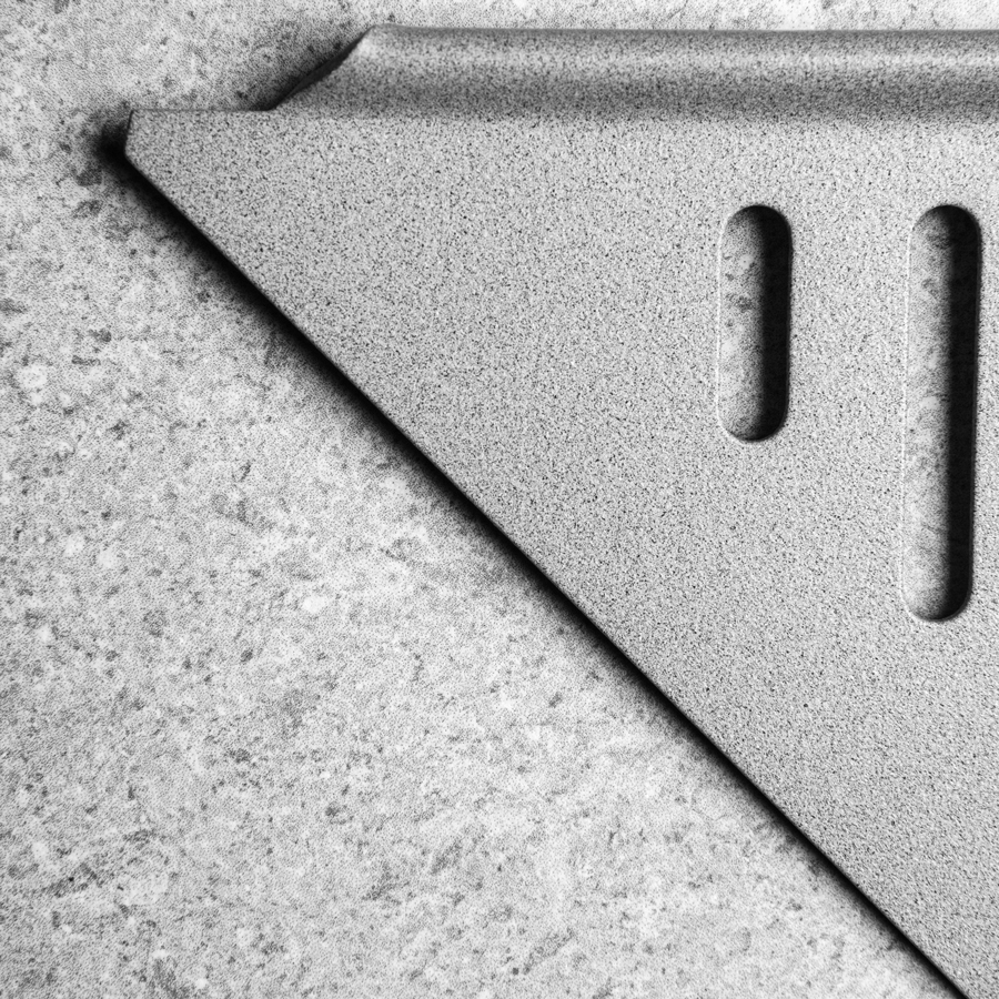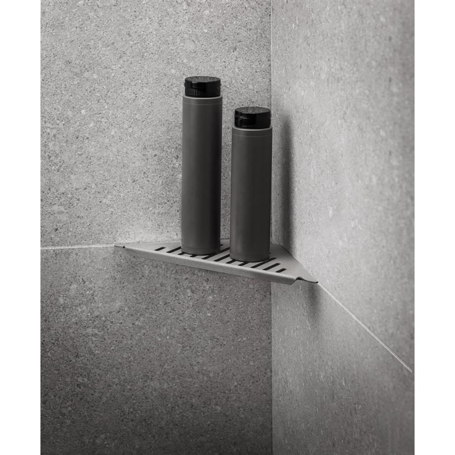 Stilren pulverlackerad duschhylla med STONE-finish i färgen Granit. Tillverkad av rostfritt stål typ AISI 304. Godstjocklek: 1,5 mm. Hyllan fästs i fogen med silikon.