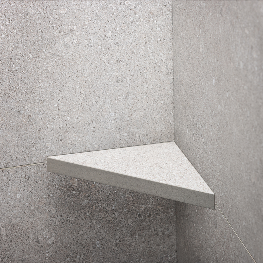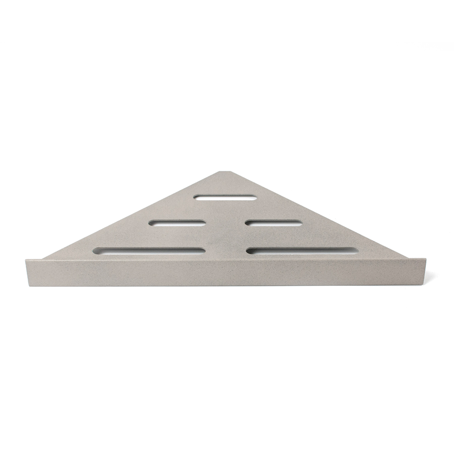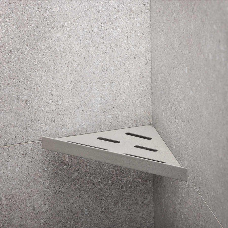 Elegant duschhylla för montering med keramiska plattor i hyllan. Hyllan fästs i fogen med silikon. Passar i 90° hörn. Tillverkad av pulverlackerat rostfritt stål typ AISI 304 med Stone-finish i färgen granit. Godstjocklek: 1,2 mm. Ej syrafast.