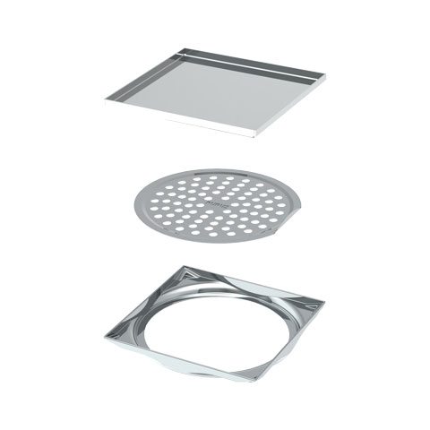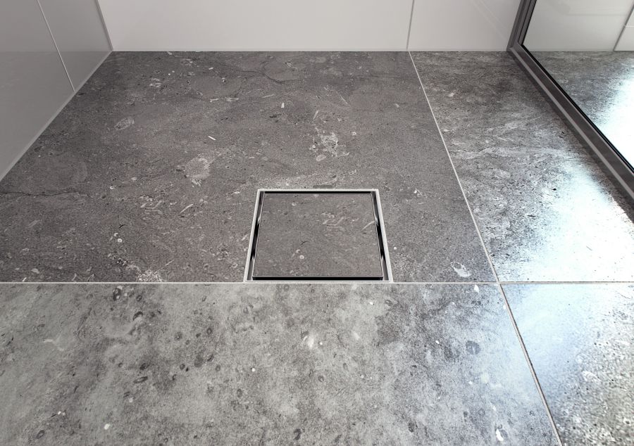 Golvbrunnssil med ram för montering av klinker. Tillverkad av borstat rostfritt stål typ AISI 304.