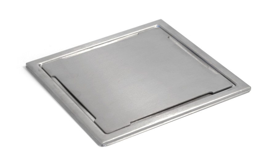 Elegant golvbrunnssil av borstat rostfritt stål typ AISI 430. Godstjocklek 1,5 mm. Ej syrafast.