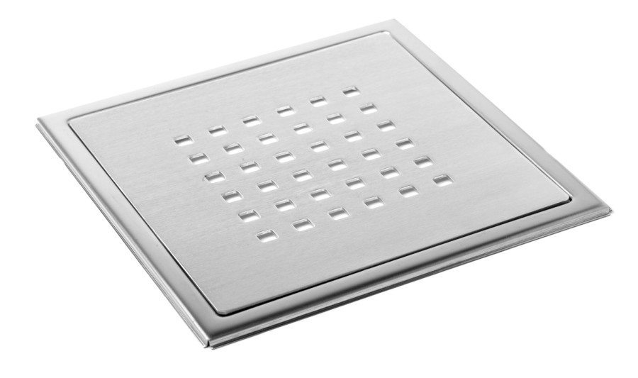 Elegant golvbrunnssil av borstat rostfritt stål typ AISI 430. Godstjocklek 1,5 mm. Ej syrafast.