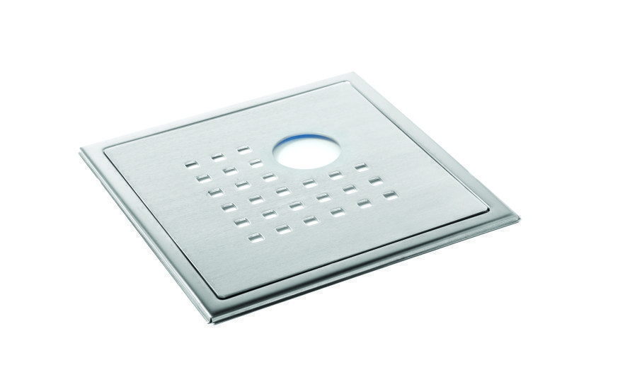 Elegant golvbrunnssil av borstat rostfritt stål typ AISI 430. Godstjocklek 1,5 mm. Ej syrafast.