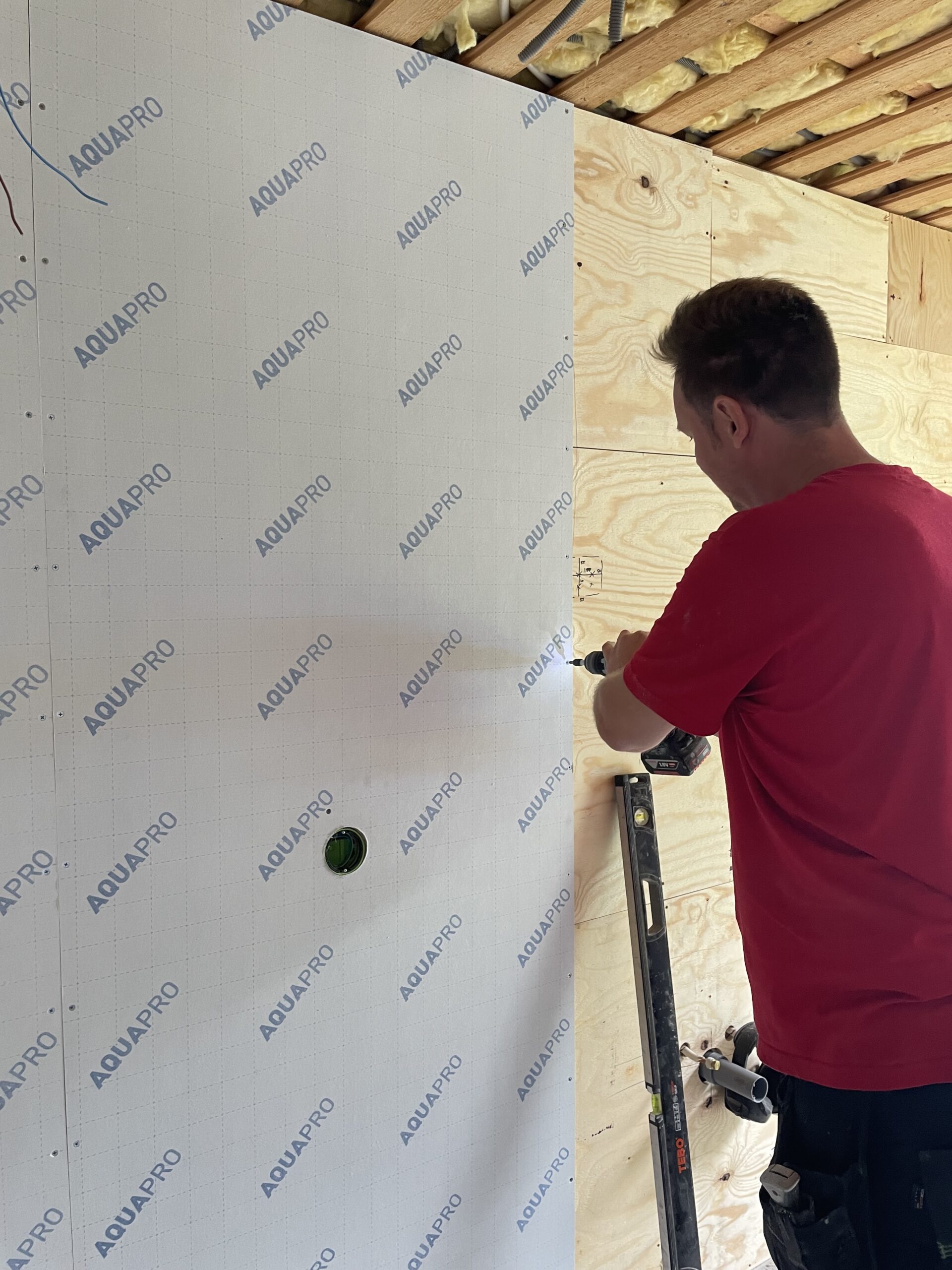 Nischen limmas mot underlaget med AquaPro Monteringslim Foilseal, skarverna tätas med AquaPro Monteringslim Foilseal eller AquaPro foiltack adhessive. Nischen är färdig för plattsättning på 8 timmar.