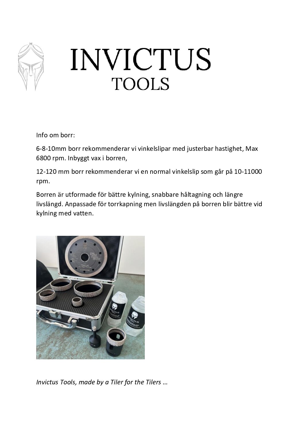 Upptäck diamantborrarna från Invictus Tools som kombinerar maximal livslängd med överlägsen prestanda! Våra borrar i storlekarna 6, 8 och 10 mm fungerar utmärkt med en vinkelslip med justerbar hastighet, max 6800 varv/min. För större dimensioner, 12–120 mm, rekommenderar vi en vinkelslip med hastighet på 10 000–11 000 varv/min för bästa resultat.