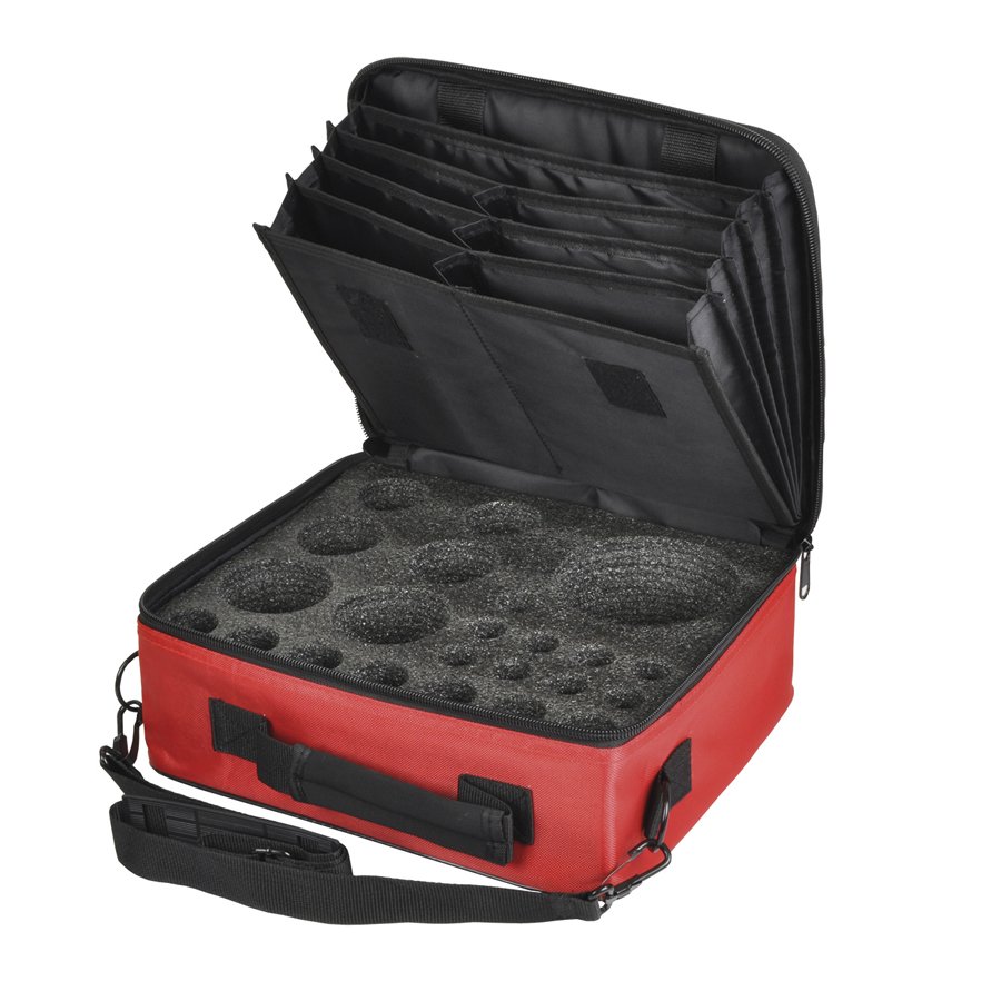 Plats för 22 st diamantborrar i storlek 6 till 120 mm och flera fack i locket för förvaring av diamantklingor eller diamantslipskålar med storlek upp till 250 mm.