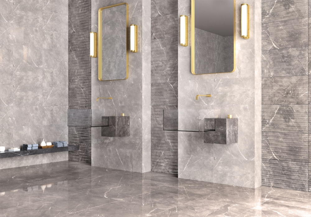 Kakel med grå marmorimitation.