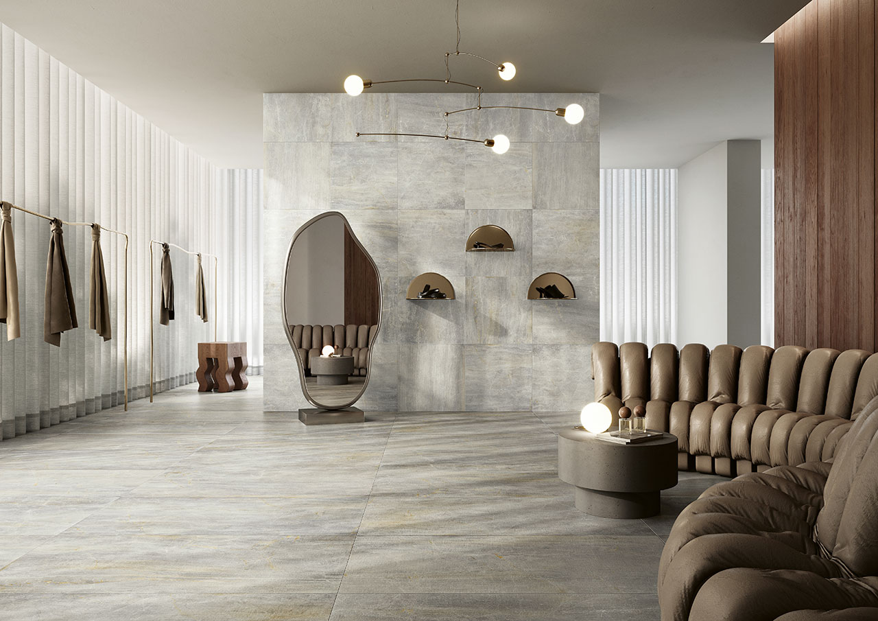 Ytorna på Fossil tolkar dessa suggestiva material, breddar materialspråket för inredning och avslöjar texturer med subtila ådror som ger en alternativ uppfattning om det keramiska materialet genom användning av intensiva färger och eleganta nyanser.