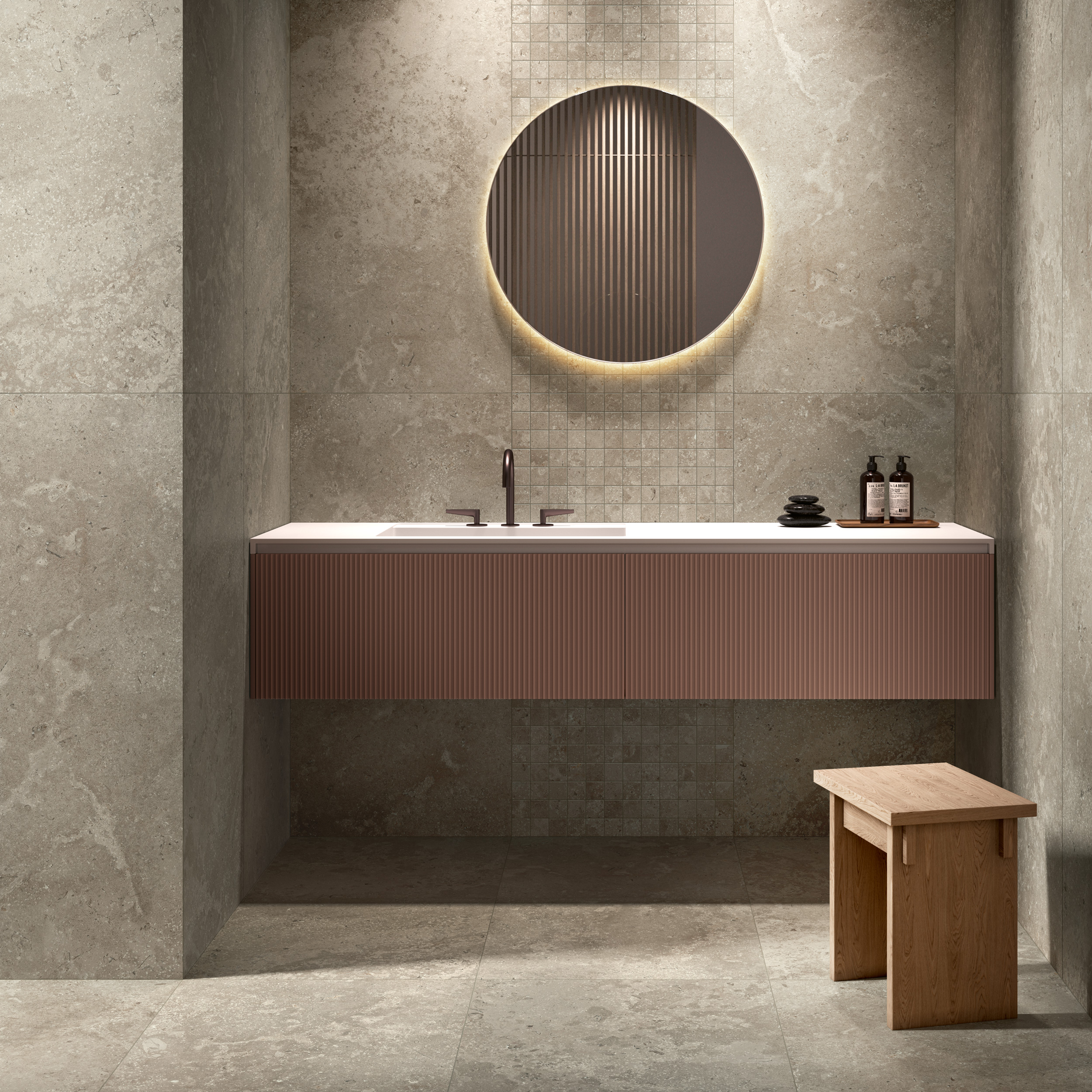 En naturlig tolkning av kalksten med en djärv samtida karaktär: ådring och ljusa färgtoner frigör all sin dynamiska elegans och tolkar interiör- och exteriördesign med stor personlighet och balans.