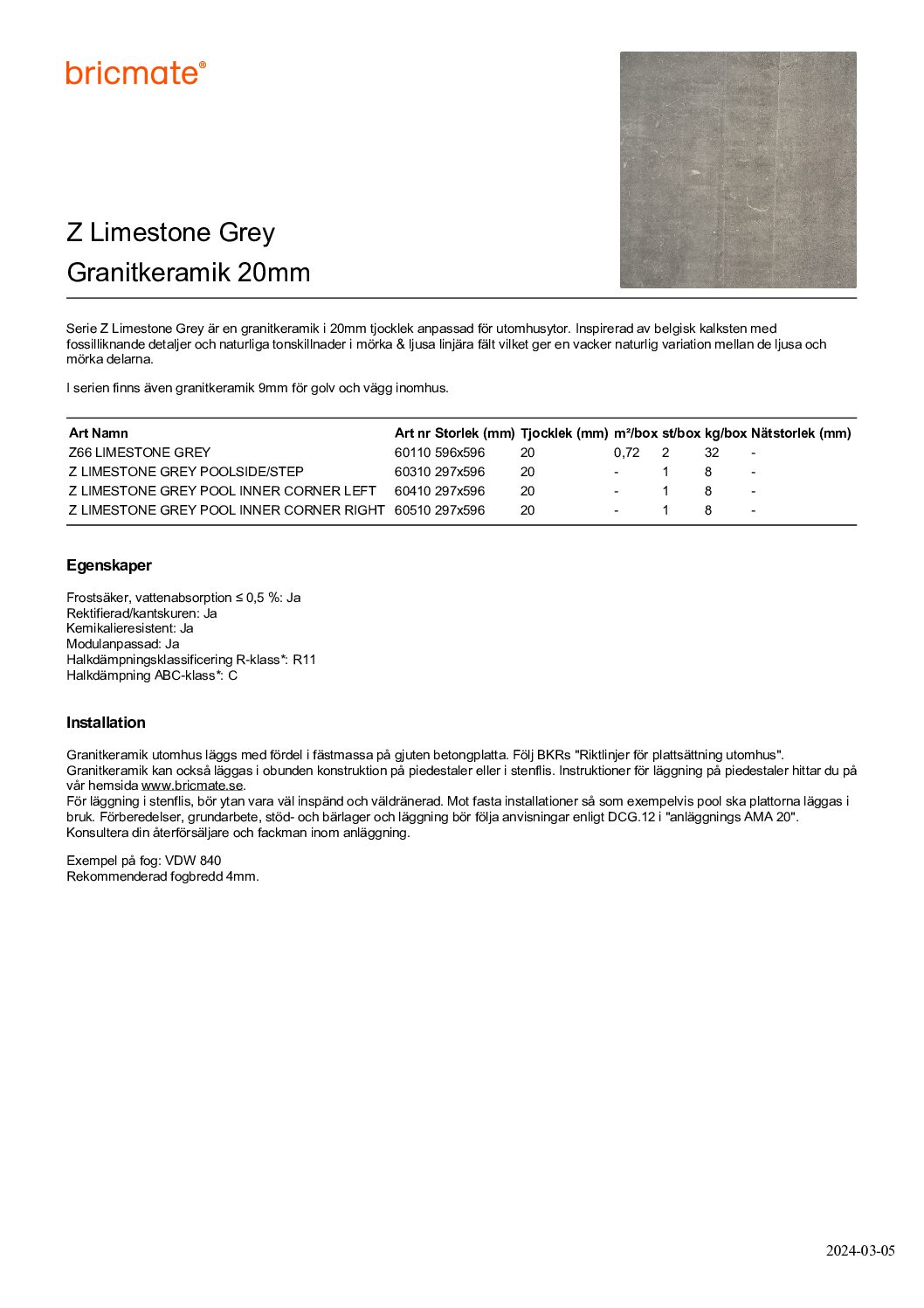 Serie Z Limestone Grey är en granitkeramik i 20mm tjocklek anpassad för utomhusytor. Inspirerad av belgisk kalksten med fossilliknande detaljer och naturliga tonskillnader i mörka & ljusa linjära fält vilket ger en vacker naturlig variation mellan de ljusa och mörka delarna.