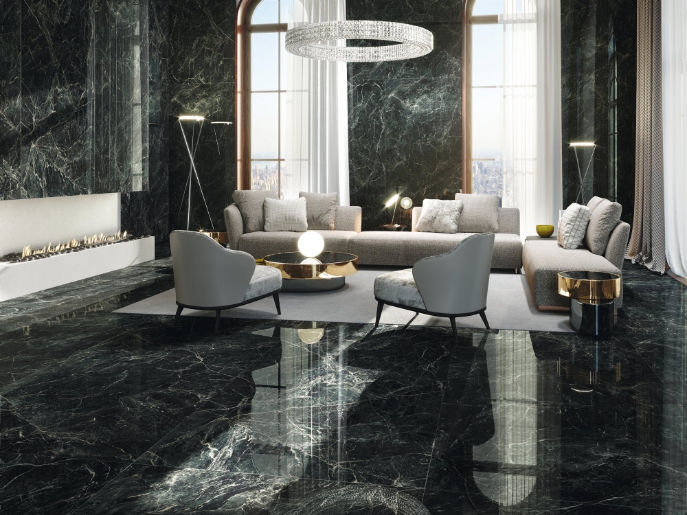 Grön granitkeramik med inspiration från verdi alpi marmor.