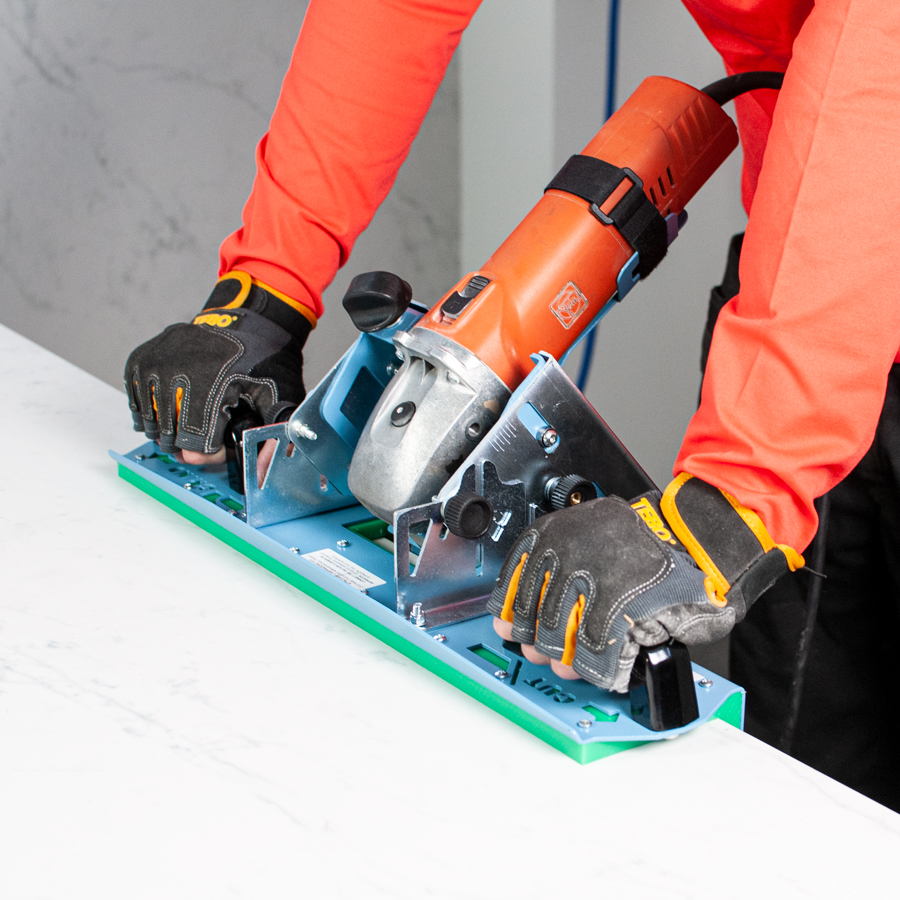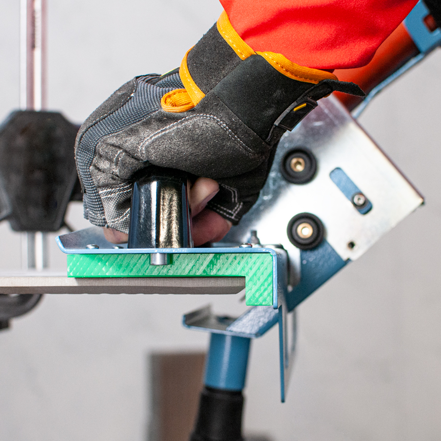 Ställ för vinkelslip med M14 gänga. Används vid torrbearbetning av kanter med vinkelslip och diamantprofil eller diamantklinga. Passar all typ av byggkeramik. Anhåll för jämn fräsning. Dammsugaranslutning Ø 35 mm. Levereras med diamantklinga för kapning av material med tjocklek 5-20 mm.