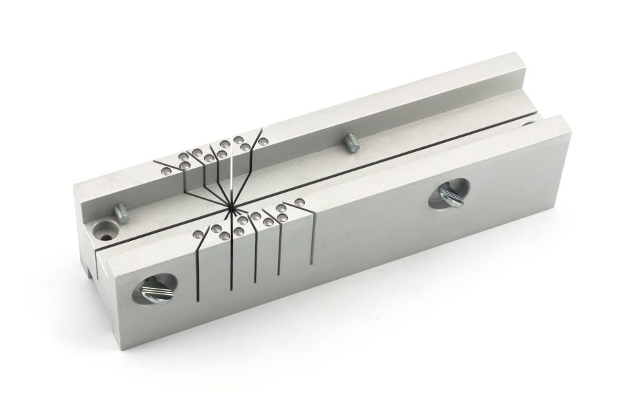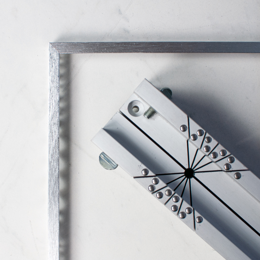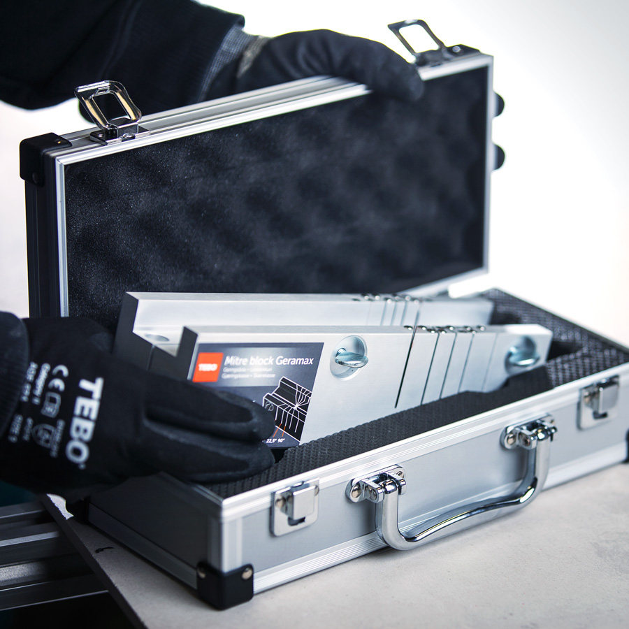 Gedigen konstruktion av eloxerad aluminium. Utrustad med 4 st vred för låsning av list. 2 st försänkta skruvhål för maximal stabilitet. Sågspår förstärkta med stålpinnar vilket garanterar längre livslängd. Levereras i praktisk förvaringsväska.
