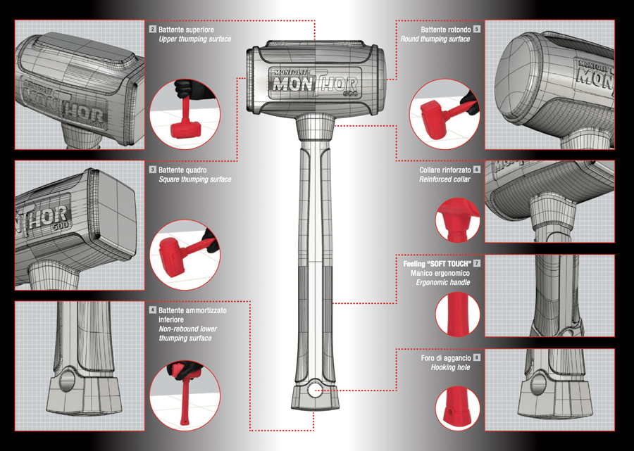 Kort handtag med bra grepp. ”No bouncing back system” som fokuserar energin och trycket i en punkt.