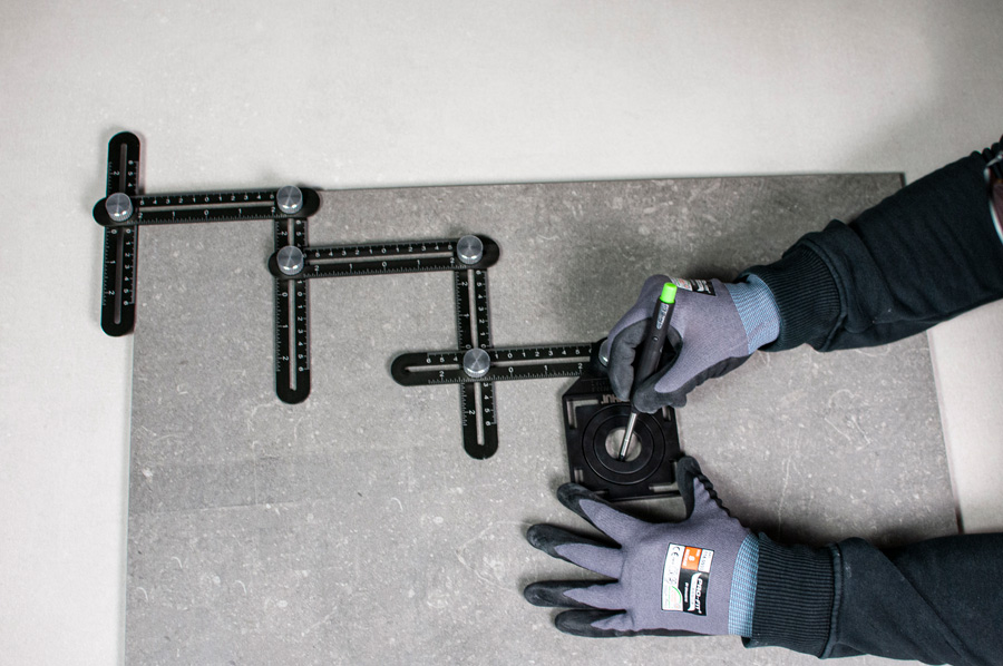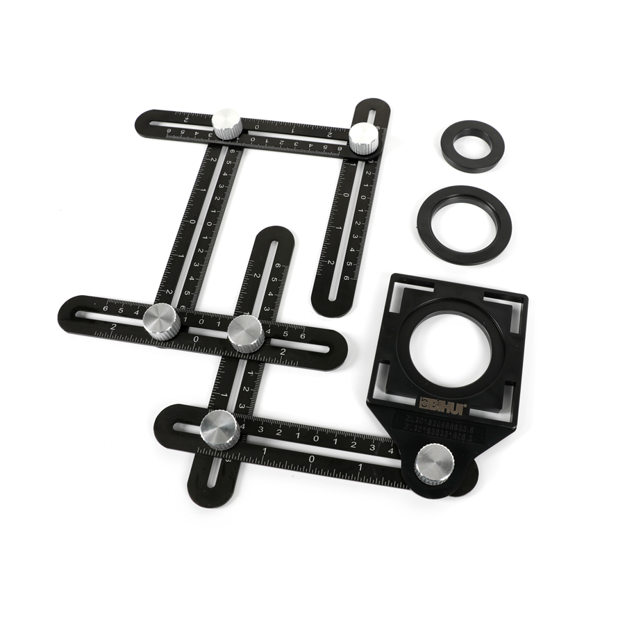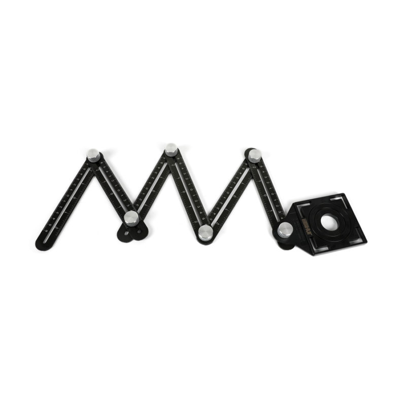 Flexibel och ledbar hålmall. Tillverkad av aluminium. Sex ledbara armar som enkelt justeras och fixeras. För uppmätning och håltagning på kakel, klinker, granitkeramik, glas, marmor etc. Justerbart hål med diameter 25, 40 och 45 mm. Laseretsad gradering för god läsbarhet. Både centimeter- och tumgradering. Kan enkelt monteras ihop med ytterligare hålmall.