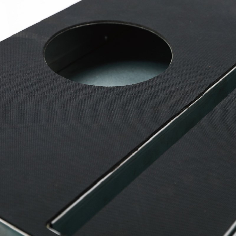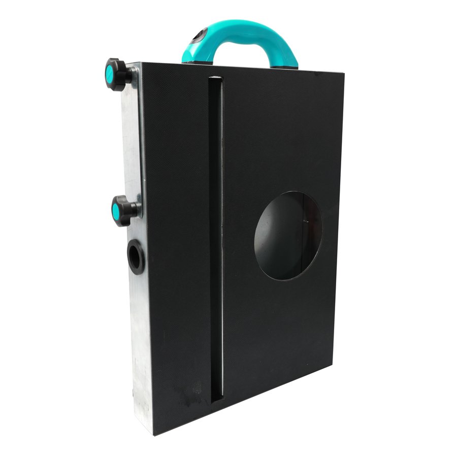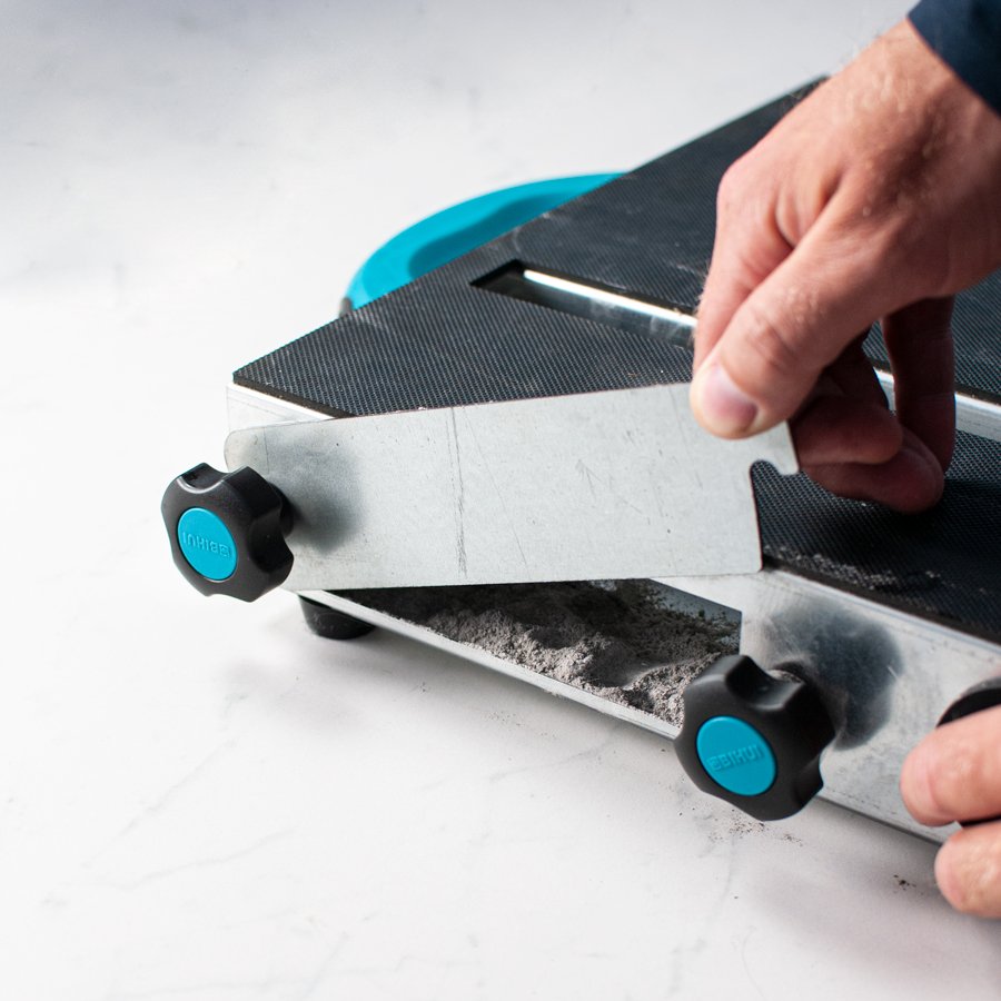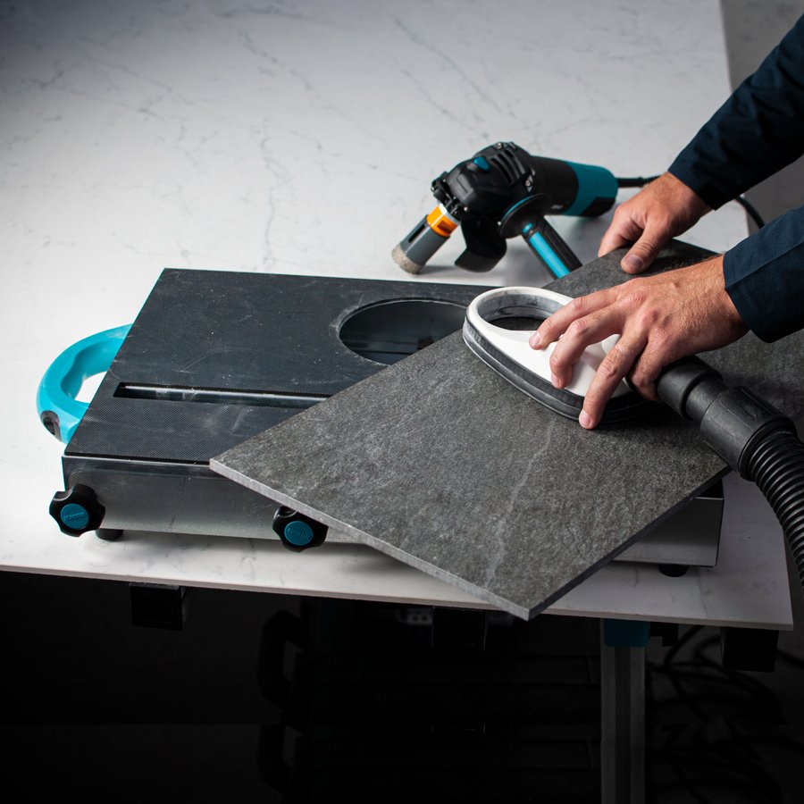 Portabel kaplåda av plåt med gummerad ovansida och Softgriphandtag. Längsgående skåra för kapning och hål för håltagning. Ansluts till dammsugare vid kapning och kombineras med ett dammutsug vid håltagning. Gummifötter gör att den står stabilt mot underlaget. Lucka för enkel rengöring av större spillbitar.