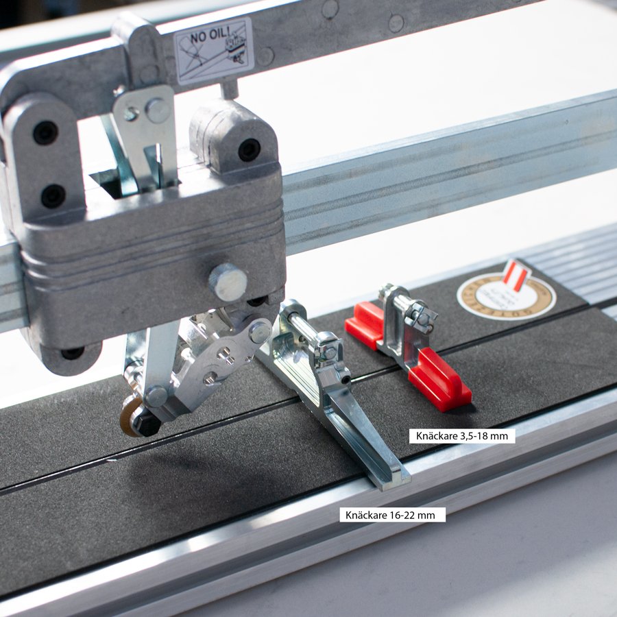 Proffsskärare med hög kapacitet och push-funktion. Robust konstruktion av gjuten aluminium och stål. Kullagrat skärhuvud med 22 mm skärtrissa. Utrustad med två knäckare för plattjocklek 16-22 mm eller 3,5-18 mm. Långt handtag och som ger ett jämnt och kraftfullt tryck längs hela plattan för ett optimalt skär. Två stödarmar för support av plattorna. Gummifötter som förhindrar att kakelskäraren glider. Låsbart skärhuvud för säker transport.
