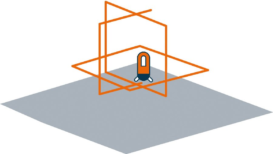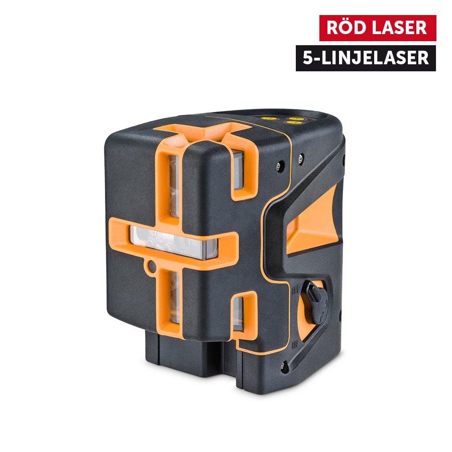 Självnivellerande batteridriven 5-linjelaser med linjer som korsar varandra i 90° mot tak och vägg.