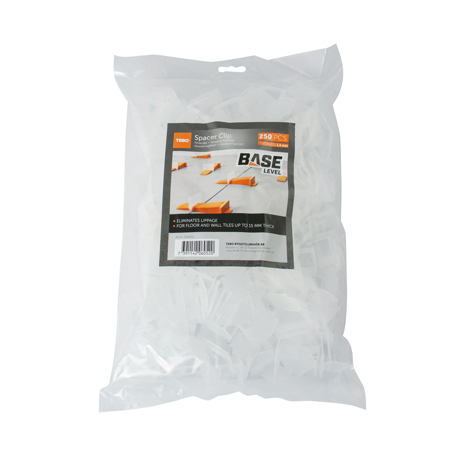 Nivådistans av polypropen. Används tillsammans med Nivåkil Tebo Base Level för att motverka fogsprång. För golv- och väggplattor med tjocklek upp till 15 mm. Fogbredd: 1,5 mm.
