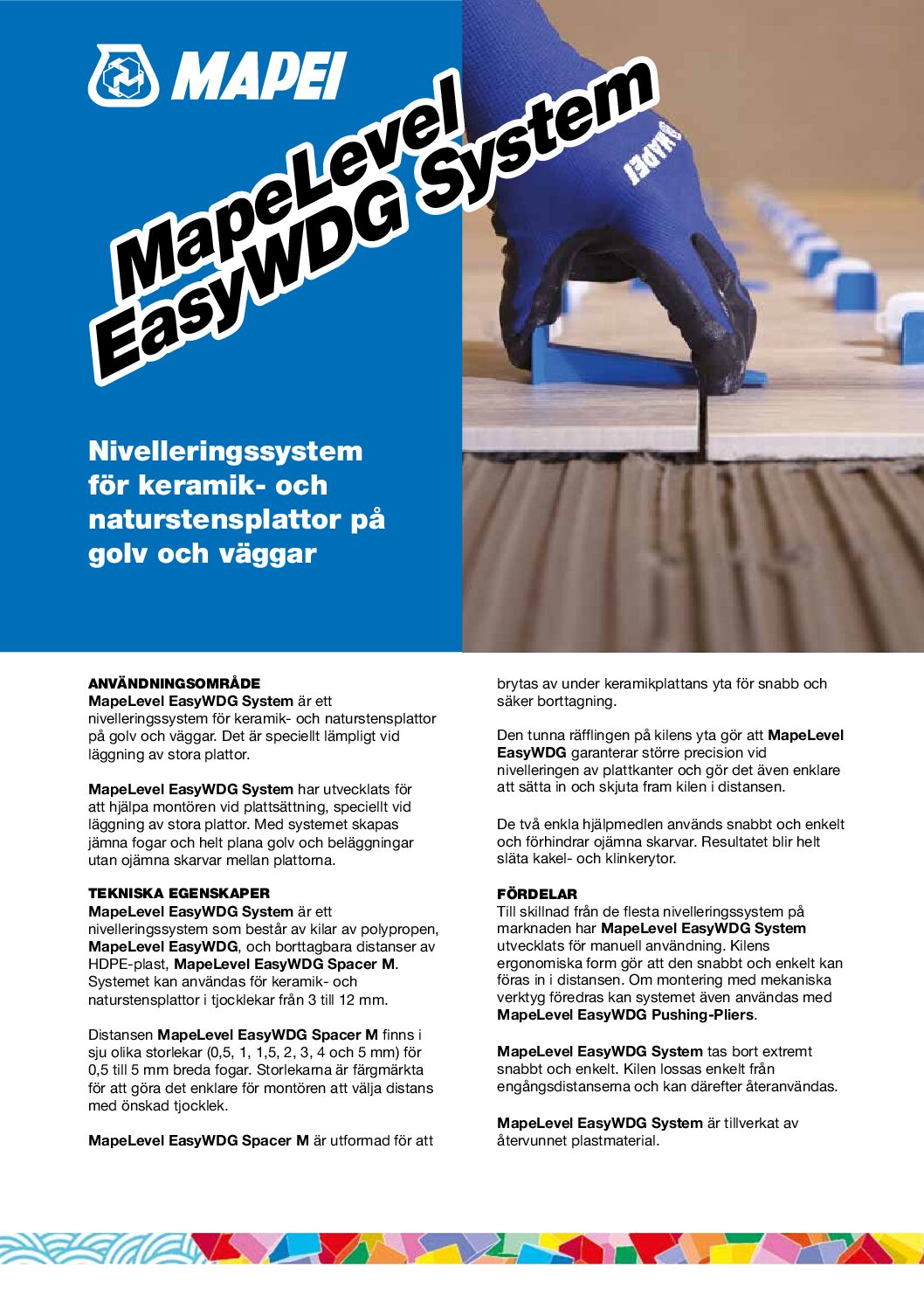 MapeLevel EasyWDG System har utvecklats för att hjälpa montören vid plattsättning, speciellt vid läggning av stora plattor. Med systemet skapas jämna fogar och helt plana golv och beläggningar utan ojämna skarvar mellan plattorna.