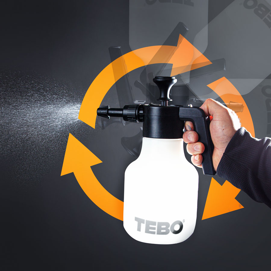 Tryckspruta med 360° funktion som gör att den behåller sprayförmågan i alla vinklar.