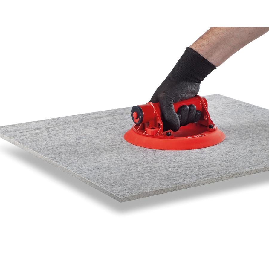 Batteridriven plattlyft för många olika typer av släta material som t.ex. kakel, klinker, granitkeramik, glas och metall. Undertryck skapas med en knapptryckning och släpps genom att knappen hålls in. Undertrycksövervakning via digital display. Vid förlust av vakuumtryck startas pumpen automatiskt tills trycket har återställts. Behåller undertrycket även vid batteribyte. Lyfter upp till 100 kg horisontellt.