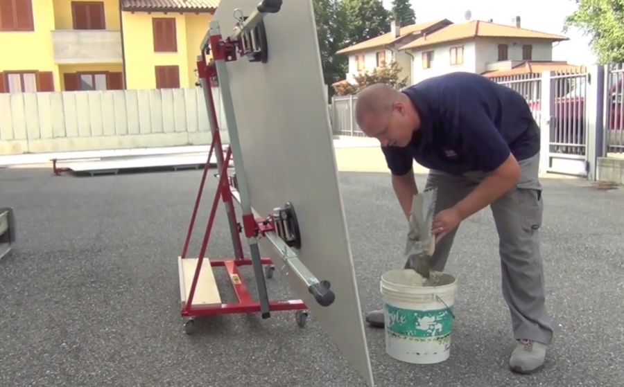 Utrustad med 4 st länkhjul med dubbelbroms. Två krokar i den övre delen av vagnen för att hänga upp plattlyft Superstick (ingår ej), vilket underlättar vid applicering av fix på plattan.