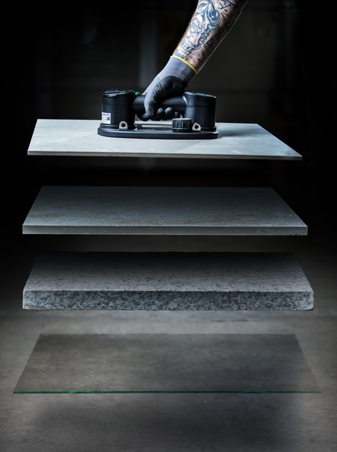 Batteridriven och extremt stark plattlyft för många olika typer material som t.ex. kakel, klinker, granitkeramik, natursten, marksten och glas.