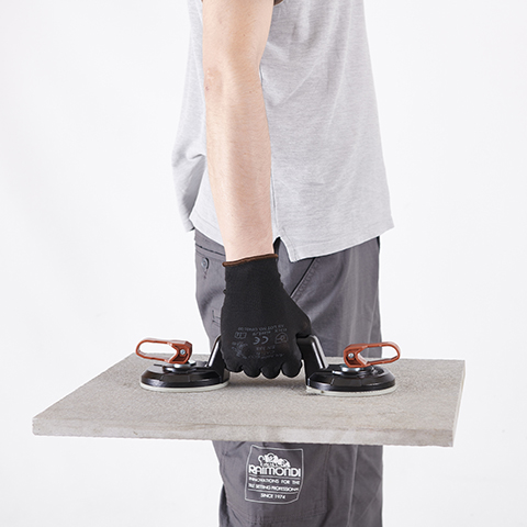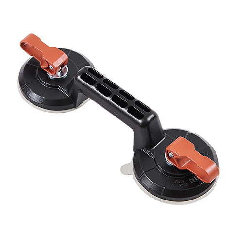 Plattlyft i aluminum med två vakuumsugkoppar som enkelt suger åt mot den keramiska plattan genom att fälla ner de orangea låsanordningarna ovanför.