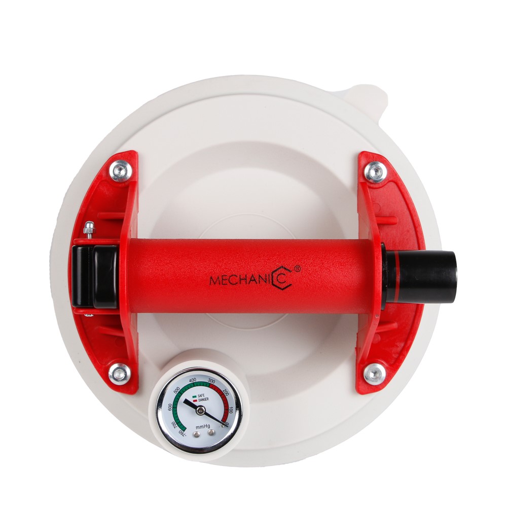 Vakuumsugkopp som kan hålla en vikt på 110 kg och som sitter fast ordentligt även på strukturerade ytor. Utrustad med manometer och en ventil för snabb frigöring. Eftersom fästytan är av vit silikon, kan du fästa sugkoppen på kakelplattor med både blanka och strukturerade ytor utan att lämna spår på kakelplattans yta. Transportväska, reparationssats och skyddsdyna ingår.