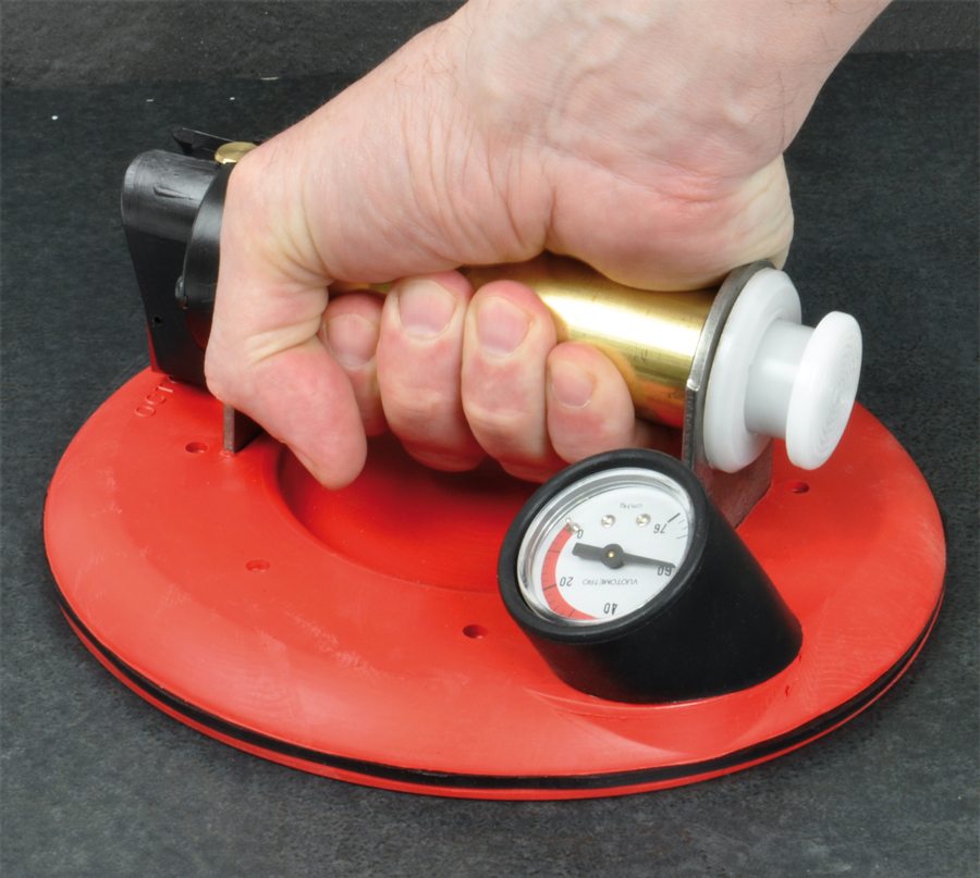 Plattlyft med sugkopp. Vakuum pumpas upp. Klarar upp till 40 kg. Säkerhetsmätare som visar omedelbart förlust av vidhäftning mot underlaget.