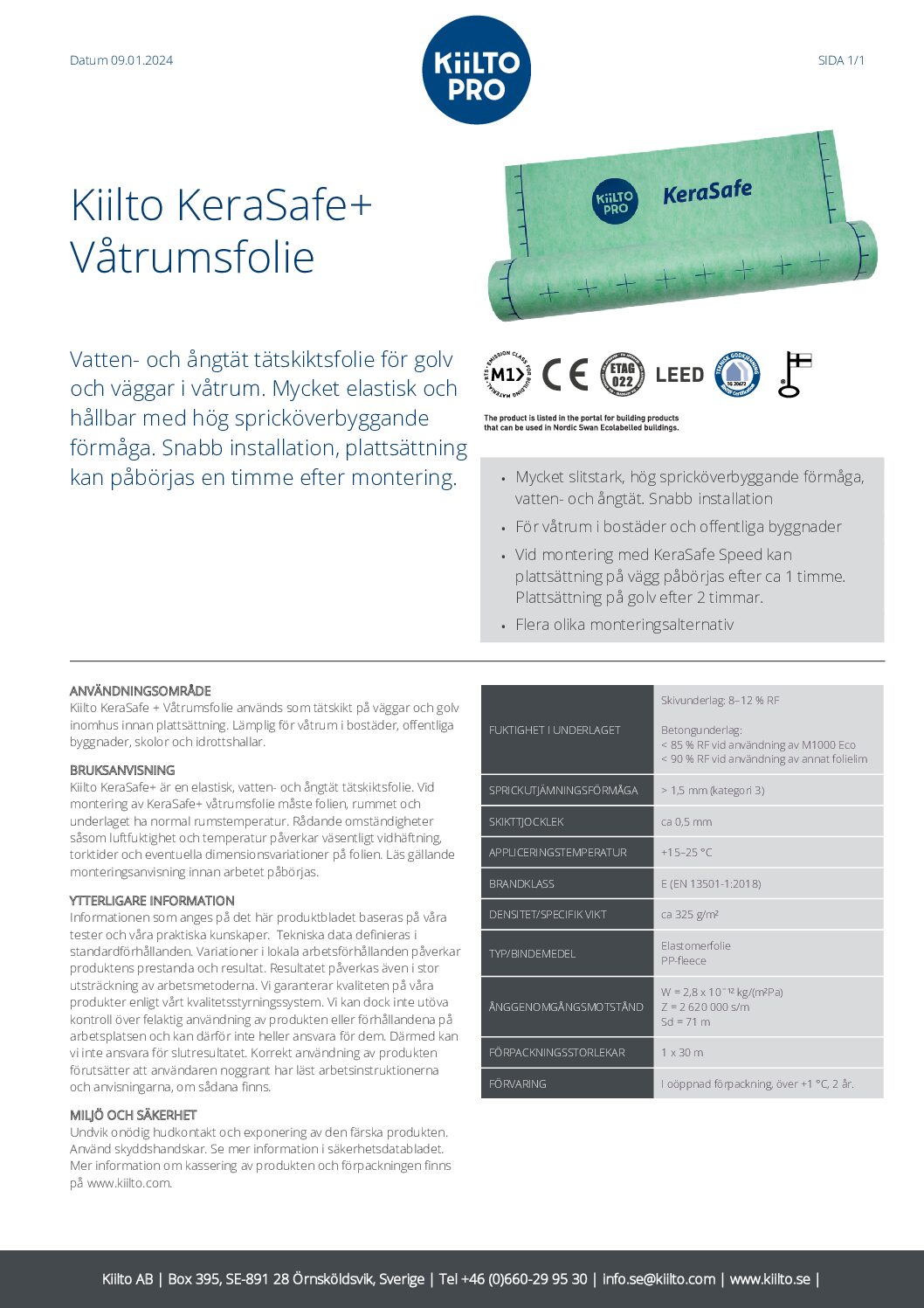 Kiilto KeraSafe + Våtrumsfolie används som tätskikt på väggar och golv inomhus innan plattsättning. Lämplig för våtrum i bostäder, offentliga byggnader, skolor och idrottshallar.