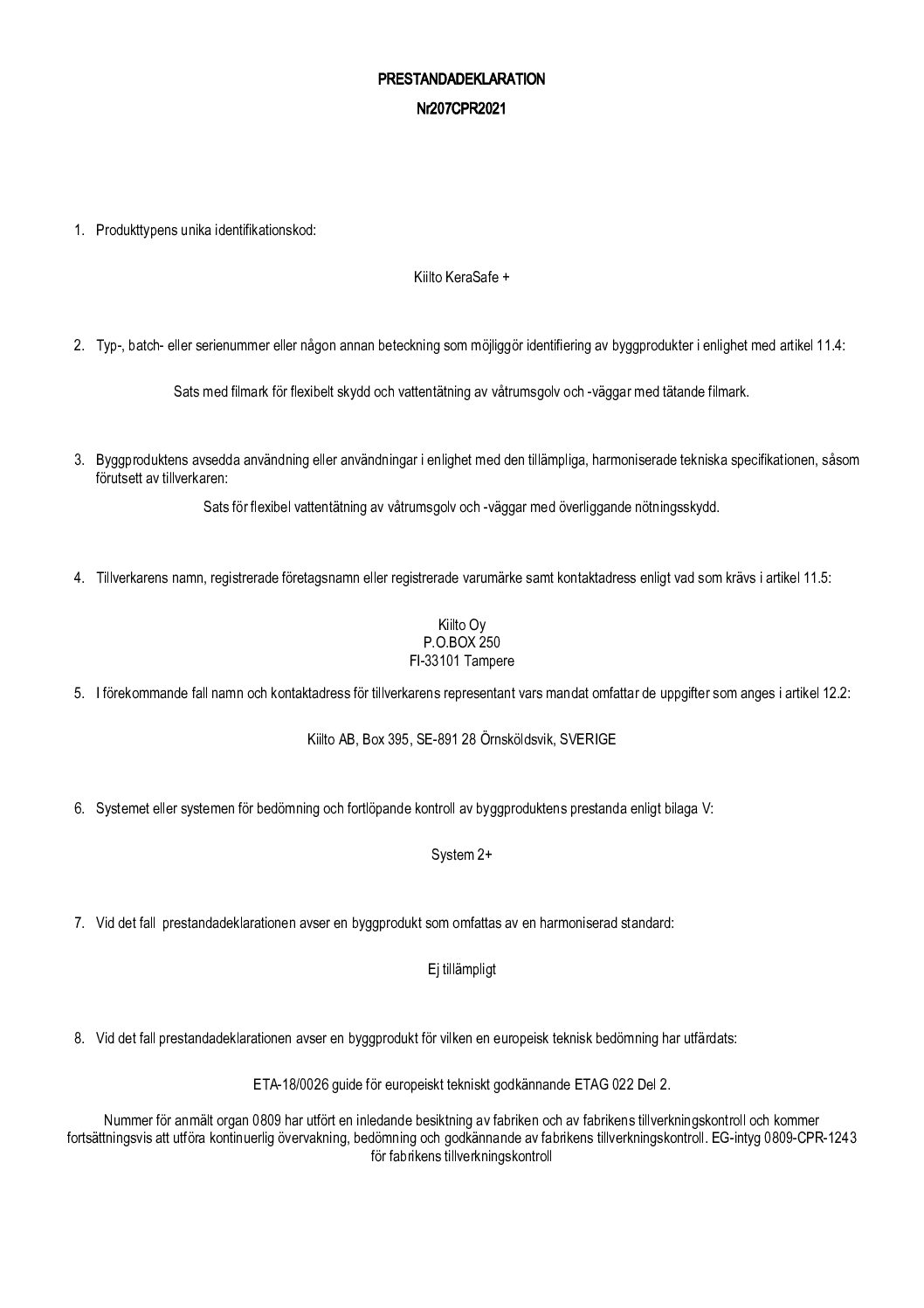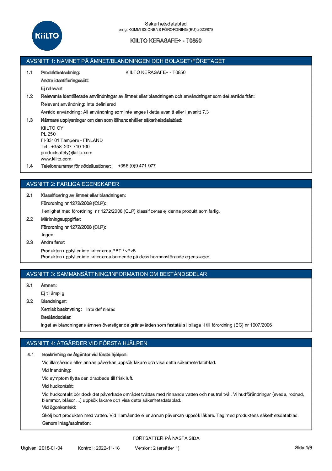 Säkerhetsdatablad för _KIILTO KERASAFE+ – T0850_ (Version 2)